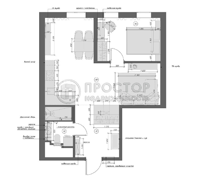 Планировка квартиры предполагает размещение просторной кухни, гостиной с зоной релакса, изолированной спальни, санузла , большое количество мест хранения.