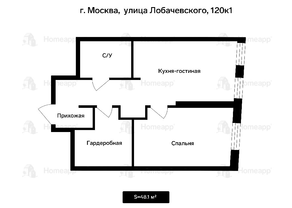 Планировка для жизни: пространство площадью 48 кв. м включает в себя просторную зону отдыха и отдельную оборудованную гардеробную, что позволяет поддерживать идеальный порядок.